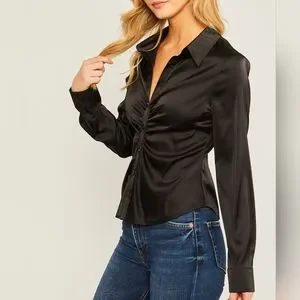 Long sleeve button down silky ruched blouse. Black. Various sizes available.