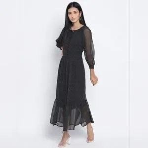 Estella is an elegant black maxi dress adorned with scattered dots resembling the night sky. Crafted from silky-like viscose polyester fabric, this dress features a flattering v-neckline, a button placket, and a flared hem. Perfect for any occasion, Estella blends sophistication and versatility effortlessly.