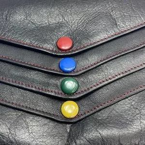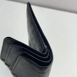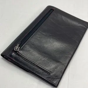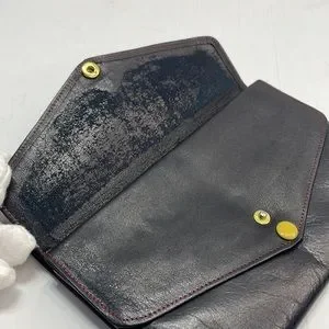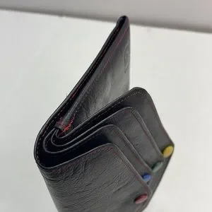 This piece is probably one of the most unique that I have received into my inventory. The exterior of the wallet is an overall very good preowned condition with a great worn leather look. The zipper has most of the black paint removed but works well. The snaps also have discoloration. When you open the wallet there are multiple snaps all of which work well. The item to note is some dryness within the wallet.