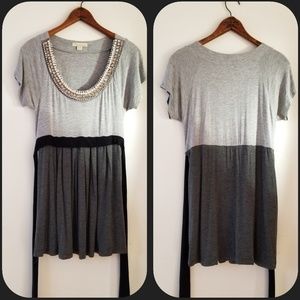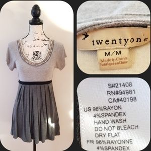 "Twentyone" 2 tone gray beautiful beaded neckline cap sleeve tie back top. This light/dark gray top is a soft t-shirt material has a black tie belt separating the lightgray t-shirt top from the flowy bottom.