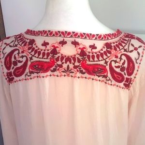 Beautiful red and coral embroidery on top of a sheer light pink blouse