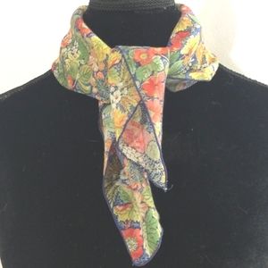 I believe this scarf to be handmade it is not perfectly square measures 23 inches at longest .21 inches at shortest point.