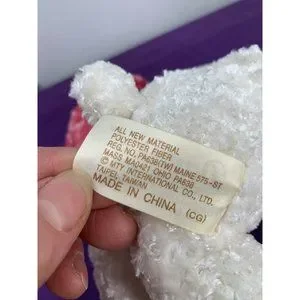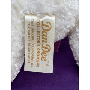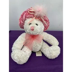 This adorable Dan Dee 8" white bear is ready to charm with its pink velvet hat adorned with a rose feather and a pink bow at the neck. Its soft, cuddly nature makes it the perfect gift for any occasion.