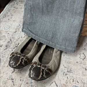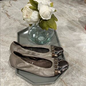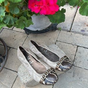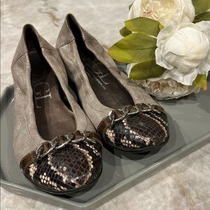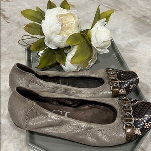 AGL attilio giusti Leombruni, cafe latte brown color super soft textile upper with metallic sheen, cap toe cream and brown snakeskin leather, ballet flats with leather and textile uppers and rubber soles with trademark silver chain across toe upper. Snakeskin print leather rounded toe. Uppers, soles, toes and heels in very good preowned condition.