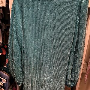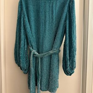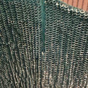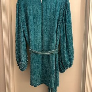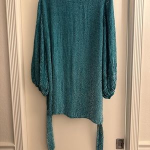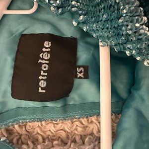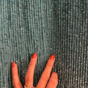 Beautiful Retrofete Grace dress. Aqua blue. Rare color. Beautiful for a holiday party or date night. Xs but is loose so fits many body types. I’m a size 4/6 Lululemon for size reference. There are a few snags as the nature of a fully sequined dress. Nothing too eye catching but reference photos to see areas of snag.