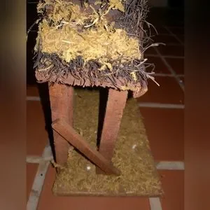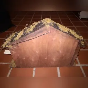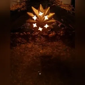 Almost perfect, Jcpenney hand-painted porcelain nativity set. Right corner of base chipped; can be hidden by adding some additional moss. Poor Mary lost her thumb. Like I said, almost perfect. Still beautiful. Star above lights up; 2 AA batteries go on side. See photos and video.