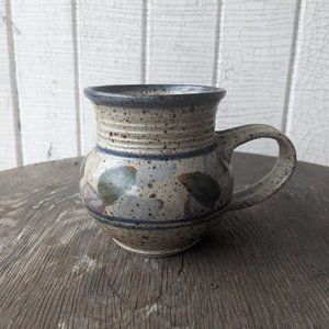 Larger mug: earthy greyish speckled with blue contrast and green, pink, blue and mustard leaf pattern