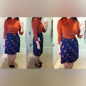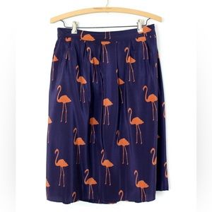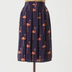 Adorable Anthropologie "Stilt Striders Skirt" by Charlotte by Charlotte Taylor is navy bluish-deep purple and has an all over coral-orange flamingo print. The skirt also has an elasticized waist in the back, pleating at the waist and an invisible back zip and hook closure.