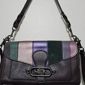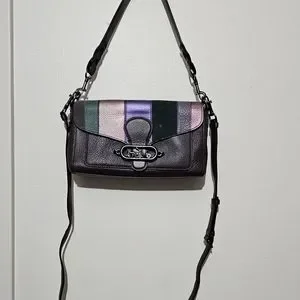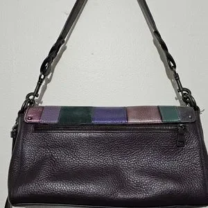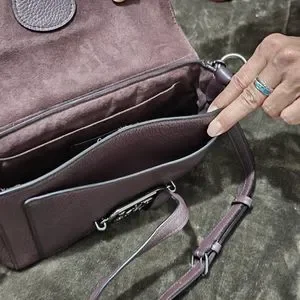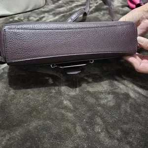 Authentic Coach Soft Pepple leather with Suede leather, color is Eggplant, gunmetal hardware, crossbody strap as well. there is one small spot on the suede leather see pics. very beautiful bag. 10 inches across, 6 inches tall, 2.5 wide on the bottom.