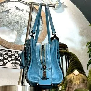 Coach 1941 Rogue 25 Tea Rose Bag Blue 58840 Handbag Floral. In new condition. Glovetanned pebble leather Inside zip and snap pockets Zip closure, fabric and suede lining Two open compartments Handles with 3 1/2" drop Detachable straps with 10 1/2" drop for shoulder wear Shoulder straps can be linked together for crossbody wear Instantly change the look of your bag with an interchangeable strap. 9 3/4" (L) × 71/2" (H) × 5 1/2" (W) Style No. 58840 Dust bag included!