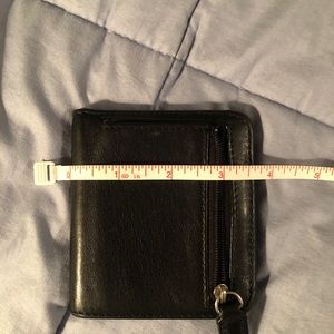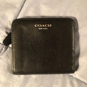 Coach black bifold leather wallet in good condition. Plastic covering photo card spot is cracked down middle, but not too noticeable once card is in there. Please review photos and ask any questions you have before purchasing.