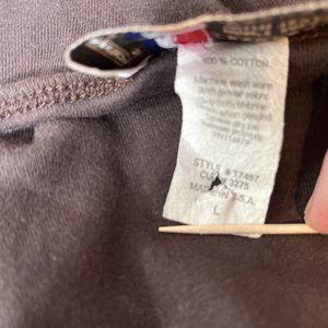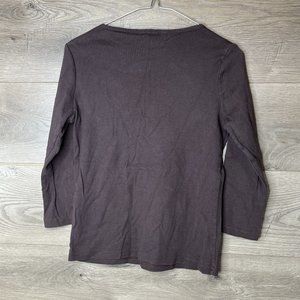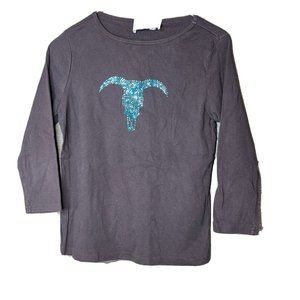Label "Don't Mess With Texas", Top, Woman's, Size Large, Brown, Long-sleeved, with Blue Rhinestone Longhorn Skull on front.Used in good
