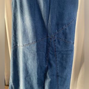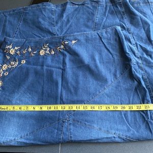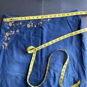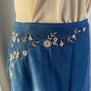 Denim like (polyester and Lycra maxi skirt, side zipper beautiful embroidery