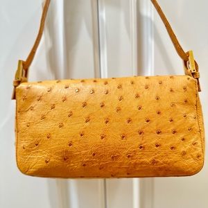 Rare Fendi Baguette Ostrich in classic brown color. The pattern on the leather is beautiful. Hardware is in gold and interior is in brown canvas. Because of the leather, the bag is more sturdy and structure and will keep your items intact. One of a kind and a collectors piece. No accessories but I will put in a generic dustbag.