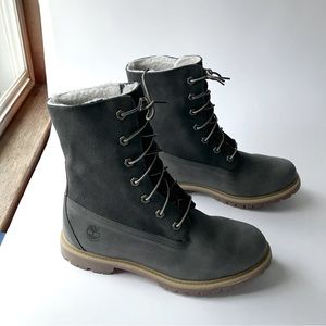 This is the Women's Timberland® Authentics Teddy Fleece Fold-Down Boot in Dark Grey Two-Tone, Size 9M / 40 Eur. NEW with tags in original box, $90. It's a gorgeous rugged chic boot with complete waterproof protection and outdoor-inspired styling --trendy, versatile, and winter-ready in two-tone dark grey leather and suede. Wear the top up or folded down for two great looks. Stay comfortable with Teddy fleece lining.