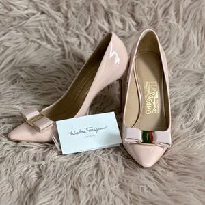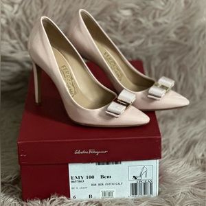 Sophisticated blush-colored Ferragamo Emy100 BonBon patent leather high heels; perfect for the chic fashionista. 2 Dusters, 2 additional heel inserts, original box and purchase receipt included. Added anti-slips to the bottom. Worn only once as my wedding ceremony shoe, so minimal wear. Size 6B (B=narrow)