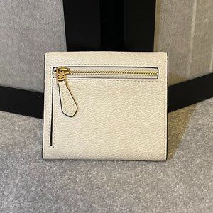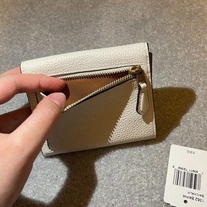 Coach Small Wallet With Apple Print in chalk color. Wallet material is polished pebble leather. Has seven credit card slots and a full-length bill compartment. Snap closure and outside zip coin pocket. Never been used and new with tags.