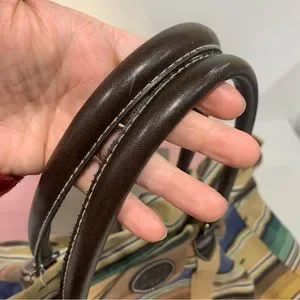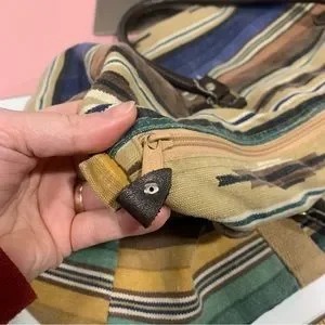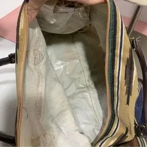 Very cool duffel bag style tote. Has a stain on the inside at the bottom shown in photo. Bag looks great and perfect from the outside. Has one outside pocket and one small pocket on the inside. Lightweight