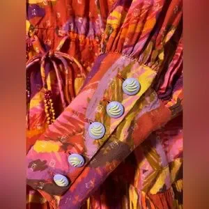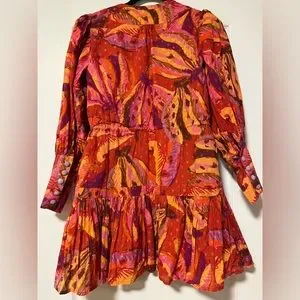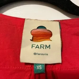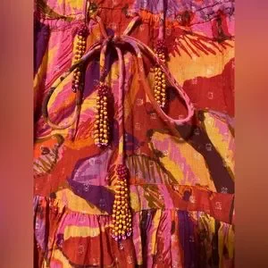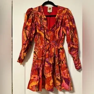FARM Rio red banana print mini dress with puff sleeves, XS, adjustable waist and can be tied at neckline too! Tiered skirt. Beautiful metallic detail in cotton (not viscose or synthetic!), along with stunning buttons at cuff and beaded tassels at neck and waist. Like new condition. Dress is lined (100% cotton) and main fabric is 97% cotton, the rest is the metallic thread detailing. This is a beautiful statement dress that works across events and seasons, and adjusts across sizing. Send a message for any measurements required!
