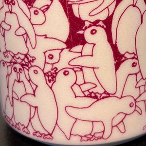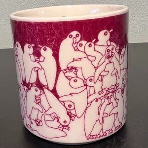 Vintage Taylor & Ng burgundy and beige ceramic mug features distinctive and imaginative wraparound artwork by Win Ng (circa 1979) of a colony of frolicking penguins engaged in the act of procreating. Part of the Nitetime Animates Collection by Taylor and Ng of San Francisco. Made in Japan in 1984. Dishwasher and microwave safe. Measures 3.5” tall with a 3.25” diameter. Holds 11 fluid oz.