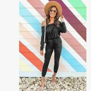 Features: Casual, Elastic Waist,One Piece,One Off Shoulder,Beam Foot, O Neck, Crewneck,Long Sleeves,Solid color, Two Pockets,Keyhole Back,Stretchable Long Pants Jumpsuit