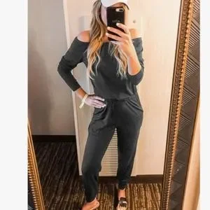 Women's Casual Long Sleeve Jumpsuit Crewneck Off Shoulder Elastic Waist Stretchy