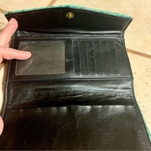 Unique ladies wallet made from Sea Bass in Alaska. Measures approximately 4.5” by 7.5”. Has black leather interior with credit card slots and two pockets for cash, and outside snap compartment for coins. The Sea Bass leather is in very good condition, some wrinkles on interior leather. There are not many Sea Bass leather wallets made, so somewhat rare, and originally made very nicely, with attention to detail. Overall very good vintage quality— about 25 years old. Comes from nonsmoking home and I ship quickly!