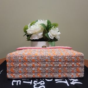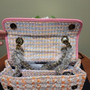 Practical and playful, this structured shoulder bag is diamond quilted in a colorful tweed. A crystal-embellished eagle head adds a signature flourish, while a pull-through chain strap that can be worn doubled or extended adds styling versatility.