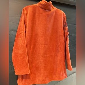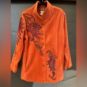 Add a Pop of Color and Style to your Winter, Fall, or Spring Wardrobe with this Vibrant Burnt Orange Fleece Embroidered Jacket/Cardigan from Bob Mackie Wearable Art. The Medium Handwash Jacket features Long Sleeves and is Hip-length. Wear it open w-T-Shirt/Blouse or Closed with its Button Closure. The Lined Jacket/Cardigan is Soft and Super Comfy and would be Perfect for any Casual/Dress Occasion!