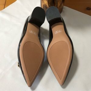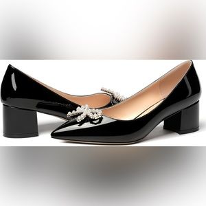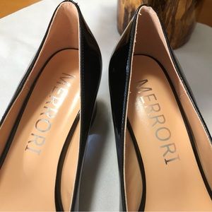 These New patent pointed toe pumps have a two inch chunk heel, pearl bow front, rubber soles, and a cushioned insole. They are made by Merrori and run large (6 1/2). K
