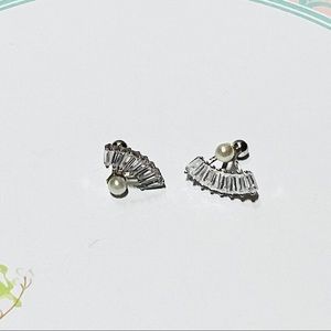 Pearl with 8-baguette tiny clear cz crystals silver 1-piece stud earring. Made of synthetic cubic zirconia and stamped S925 sterling silver. Round ball earring back closure. Looks like a folding hand fan.