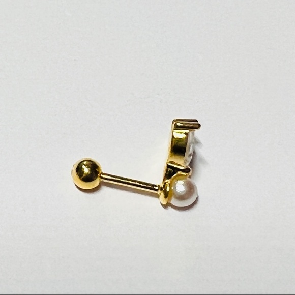 One pearl with 3 clear marquise crystal cz gold 1-pc pierced stud earring. Looks like a badminton birdie! Made of synthetic cubic zirconia and gold-plated stamped S925 sterling silver. Round ball earring back closure.