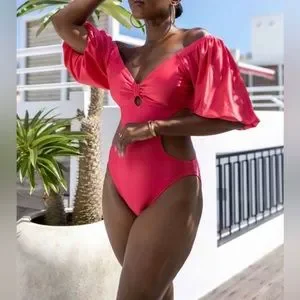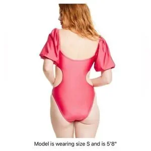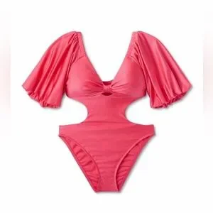 Metallic puff sleeve cut out medium coverage one piece swimsuit. Featuring a not detail keyhole front, statement cut outs on the sides, short puff sleeves and a high leg silhouette.