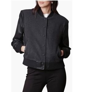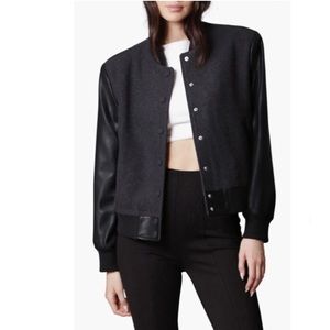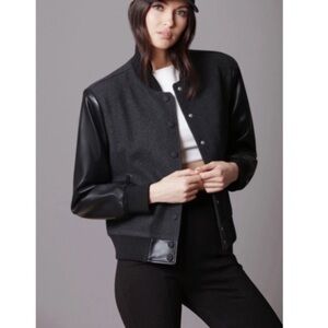 # Avec Les Filles Strong Shoulder Bomber Jacket LA Los Angeles charcoal grey Peta approved vegan rare sustainably green earth friendly Anthro Anthropologie Saks Nordstrom Vince Rag & Bone Zadig & Voltaire Celine pleather fake leather snaps school coat vintage look retor classic classy boyfriend coat quality staple Classic as seen on Kristen Stewart Kerry Washington Lili Reinhart Rihanna Taylor Swift colorblock color block color-block colorblocked color blocked color-blocked two toned two-toned rock star rock 'n roll punk pop star