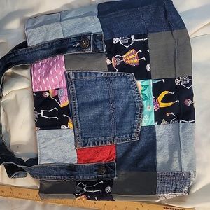 handmade from upcycled jeans. 3 functional outside pockets plus 3 additional pockets inside