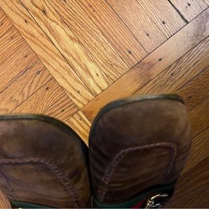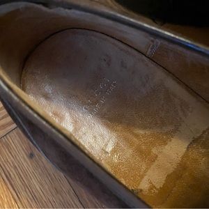 Gorgeous loafers. Great Mens suede Gucci loafers. Sole has been redone so it does not have Gucci markings. Markings are on interior insole. Do not know size, entire sole measures 11.5 inches across. Please know your sizing. Wear to current sole. Please message with any questions :)
