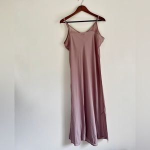 this color is like a soft blush/purple that would compliment many skin tones. both sides of the dress have slits.