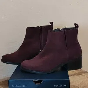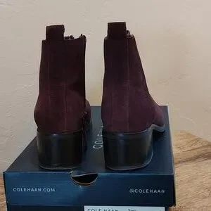 Burgundy (black garnet) suede booties in excellent used condition. Inside zippers, outside elastic gusset. 2 inch heels.