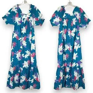 Vintage Hawaiian Maxi Dress Mumu Muumuu Floral Blue Pink White