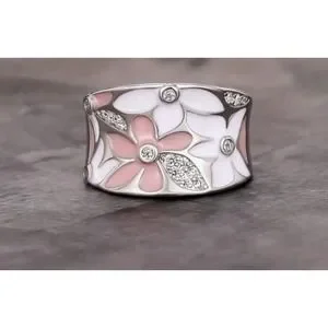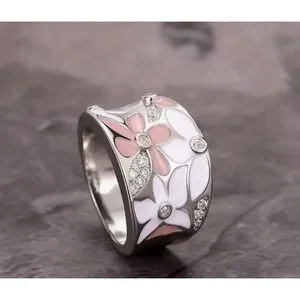 Silver Plated Zircon Pink Enamel Flower Rings For Women Daily Casual Wide Rings Jewelry