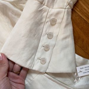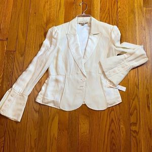 New silk skirt set, brand new condition with tags. Victorian seam style jacket, flare sleeve jacket, bell sleeve jacket. Ivory blazer, cream blazer, white blazer. Vintage style suit, quiet luxury, old money. Ivory suit, cream suit, white suit. Business casual. Flare sleeve blazer, bell sleeve blazer.