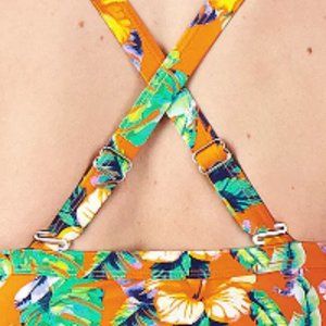 Features: sweetheart neckline, ruched twist front detail, adjustable back straps with metal ring and oval adjuster, self brief attached at waist seam