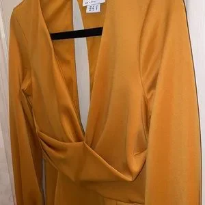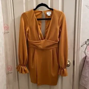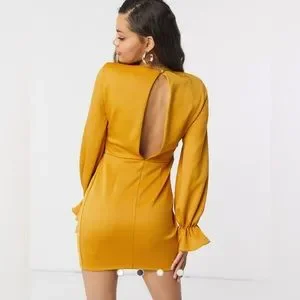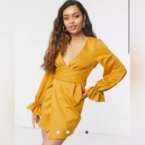 ASOS Design Petite Wrap Plunge Mini Dress with Flute Sleeve in Mustard