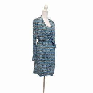 CALVIN KLIEN Women's Faux Wrap Sz 4 Blue Long Sleeve Geo Print Midi Dress