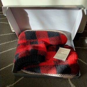 New with Tags, in original box, cozy, Slipper socks in red and black, buffalo check pattern. Get cozy in these soft, warm, fleece slipper socks.These slippers are ready for gift giving as well, they arrive in original box with To and From on box and on slipper tag.