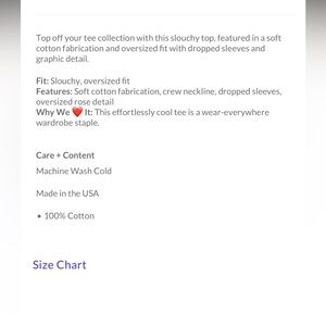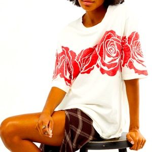 Ivory combo color with a beautiful red color rose detailing. Slouchy oversized fit. 100% cotton. Drop sleeve. This effortless style is a wear everywhere wardrobe staple. NWT still new in packaging. Small is 18” ptp and medium 19”