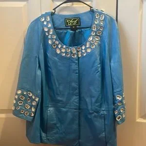 Plus size 1 x. Excellent condition. Worn once. All stones intact snap front. Men’s shoulder to him is about 26 inches. Hits around the hips. Great color. Statement piece. Front pockets.