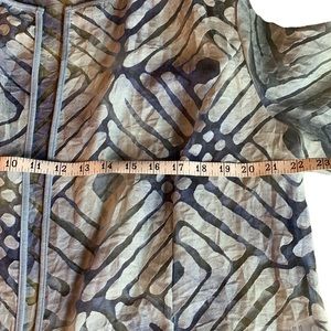 Chico’s sheer blazer- top to wear over your tank top. See through fabric in shades of blue. Round neck. Open front. 3/4 sleeves. Soft piping around all the edges. Nice top for work, business, church or other professional setting. Worn once for a beach wedding in Florida. Washed in cold water, gentle cycle and hung dry. Comfortable. Not restricting. Good for long days or packing for travel. It’s a Chico’s Size 2 = Large / size 12. See the Chico’s size chart in the photos.