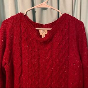 Red sweater with speckles. Womens XL. Bottom is lightly stitched up to make it a little shorter and more fitted. Can easily be taken out to make it a few inches longer.