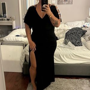 High thigh high slit, open shoulders with sparkle straps- comfy and stretchy! Bought it for a black tie wedding but ending up going with the other dress. Only worn for this pic!